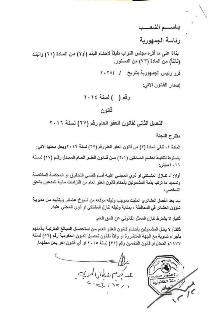 الرئيسيةالسياسةمسودة "قانون العفو العام" قبل تصويت عليه من قبل مجلس النواب السياسة مسودة “قانون العفو العام” قبل تصويت عليه من قبل مجلس النواب 0 180 ديسمبر 2, 2024 كتب بواسطة المنهج نيوز شارك FacebookTwitterPinterestWhatsApp مسودة “قانون العفو العام” قبل تصويت عليه من قبل مجلس النواب FacebookTelegram شارك FacebookTwitterPinterestWhatsApp المادة السابقةمسودة قانون الاحوال الشخصية الجديدالمقالة القادمةمجلس النواب يرفع جلسته ليوم غد الثلاثاء مقالات ذات صلة السياسة قصف جوي يستهدف مقر اللواء 40 التابع للحشد الشعبي في قضاء الدبس بمحافظة كركوك مارس 13, 2026 السياسة الفصائل العراقية تعلن تنفيذ 31 عملية خلال الـ24 ساعة الماضية مارس 13, 2026 السياسة القائد العام للقوات المسلحة محمد شياع السوداني يؤكد على صون استقرار العراق ومحاسبة المقصرين خلال المرحلة الحرجة مارس 4, 2026 ترك الرد إلغاء الرد التعليق: من فضلك ادخل تعليقك اسم:* من فضلك ادخل اسمك هنا البريد الإلكتروني:* لقد أدخلت عنوان بريد إلكتروني غير صحيح! الرجاء إدخال عنوان بريدك الإلكتروني هنا الموقع: احفظ اسمي والبريد الإلكتروني وموقع الويب في هذا المتصفح للمرة الأولى التي أعلق فيها. الأكثر شهرة إصابة خمسة أشخاص في ساحة التبادل التجاري بالجانب الإيراني، بينهم عراقيان وثلاثة إيرانيين، مارس 24, 2026 محافظ البصرة يوجّه بدخول الشاحنات عبر منفذ الشلامجة دون قيود مارس 24, 2026 محافظ البصرة يوجه بتعطيل الدوام في مدارس البصرة والجامعات ليومي الاربعاء والخميس مارس 24, 2026 أصوات الانفجارات في البصرة ناجمة عن قصف استهدف مواقع في مدينة آبادان الإيرانية الحدودية مارس 24, 2026 تحميل أكثر احدث التعليقات Sarat على البنك المركزي يصدر بياناً بشأن حرمان بعض المصارف العراقية من التعامل بالدولار
