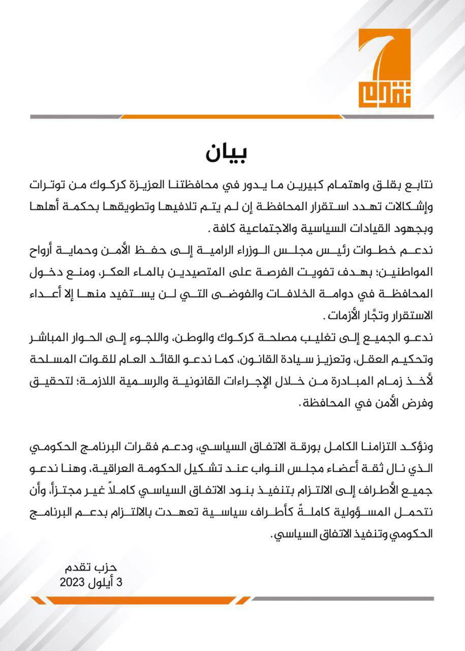 بالوثيقة.. حزب تقدم يعلن تاييده للاتفاق السياسي ولخطوات رئيس الوزراء لحفظ الامن بكركوك ويدعو الجميع الاطراف الى الالتزام بتنفيذ الاتفاق السياسي واللجوء للحوار المباشر وتغليب مصلحة المحافظة والوطن